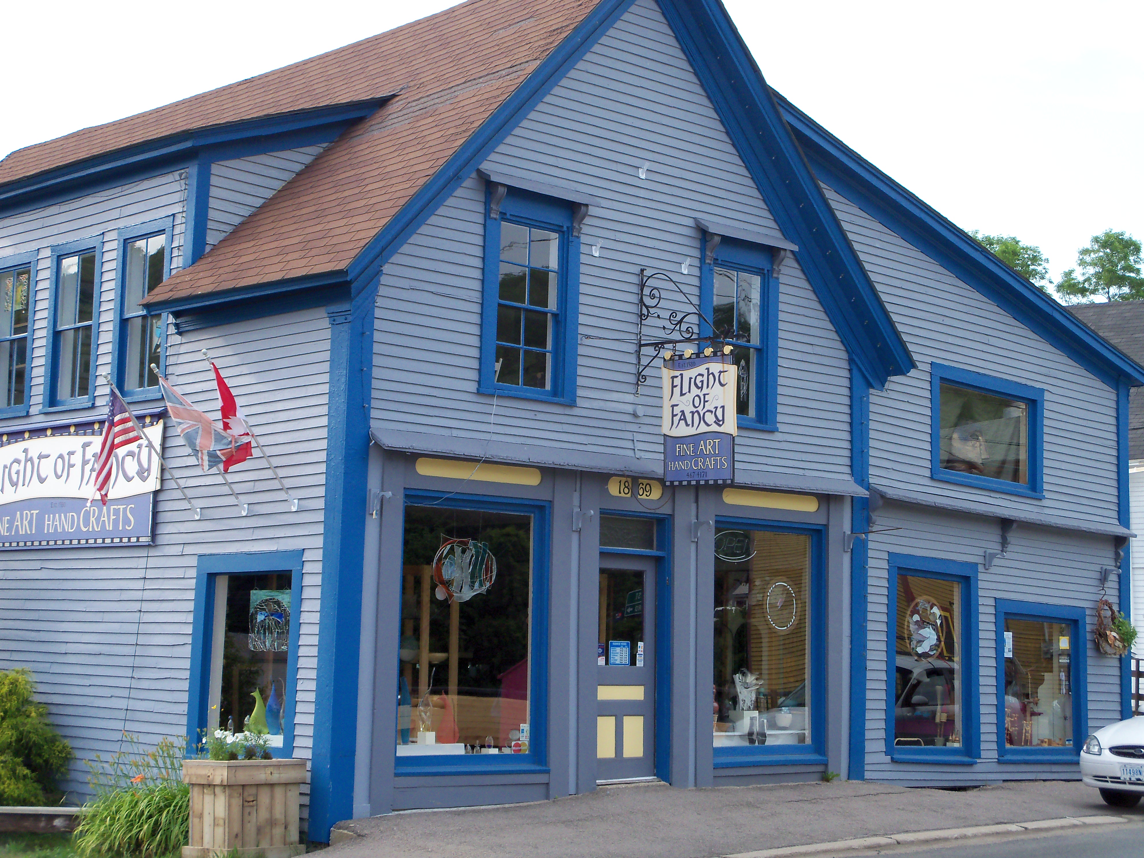 The building was the home of Bear River Home Furnishings until sold to a group of local artists/craftspeople in the early 1980’s who formed the Flight of Fancy Crafts Co-operative. Unfortunately, they found the co-operating part difficult and one member, Rob Buckland Nicks bought it and made it a single proprietorship. He runs the shop from May through October, and has established a reputation as one of the finest craft shops in the province.