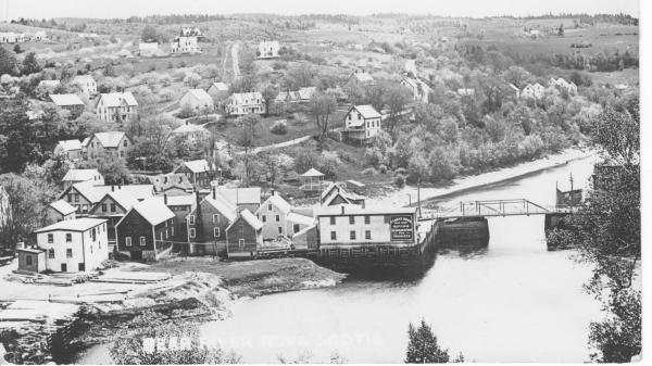 Andrew Harris building, 1845. This building has a long history of commercial use; originally built by Andrew H Harris, master mariner and shopkeeper, near his wharf on the east side of the river. He purchased the lot from Robert Jefferson in 1845 for five pounds. The store was sold to John Troop in 1881 and it was used as a customs house until 1903. in early deed it was described as the wharf lot with wharf and store. Later a Bandstand was built in the lot between the store and river. The Clarke Bros. owned and operated a store here from 1903 to 1924, and it continued as a store in various capacities, purchased by Flight of Fancy Crafts co-operative in 1982. The building is built on stilts to allow for the flow of the river under it at high tide, as the lands behind the store are a man made landfill project.